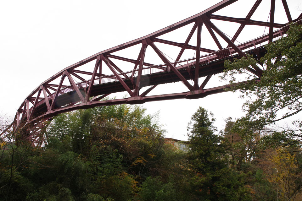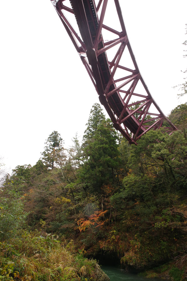 さて、北園地の駐車場から視点場へ向かう途中、五郎座橋の先に大きなクレーン車が見えました。