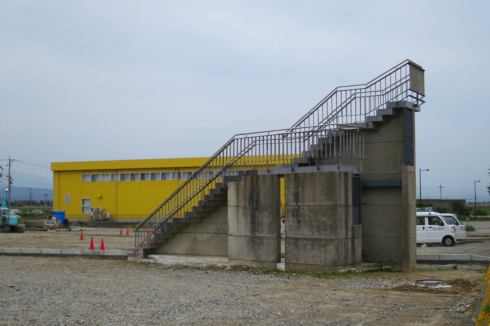 車遊館跡地の一部では区画を区切っての整地が行われていました。展望台(?)の階段部分だけが残っていて、トマソンのような状態になってます。