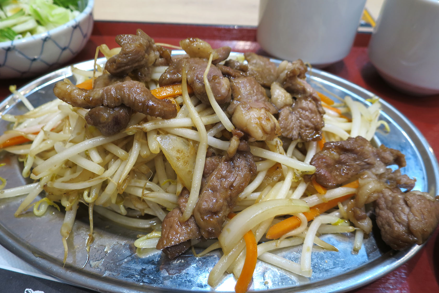 肉がメニューの写真とずいぶん違う感じはしますが、もやしのボリュームは相変わらずすごいです。