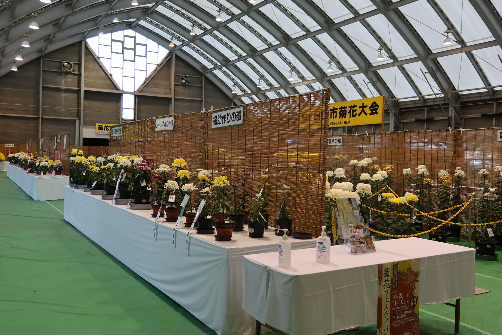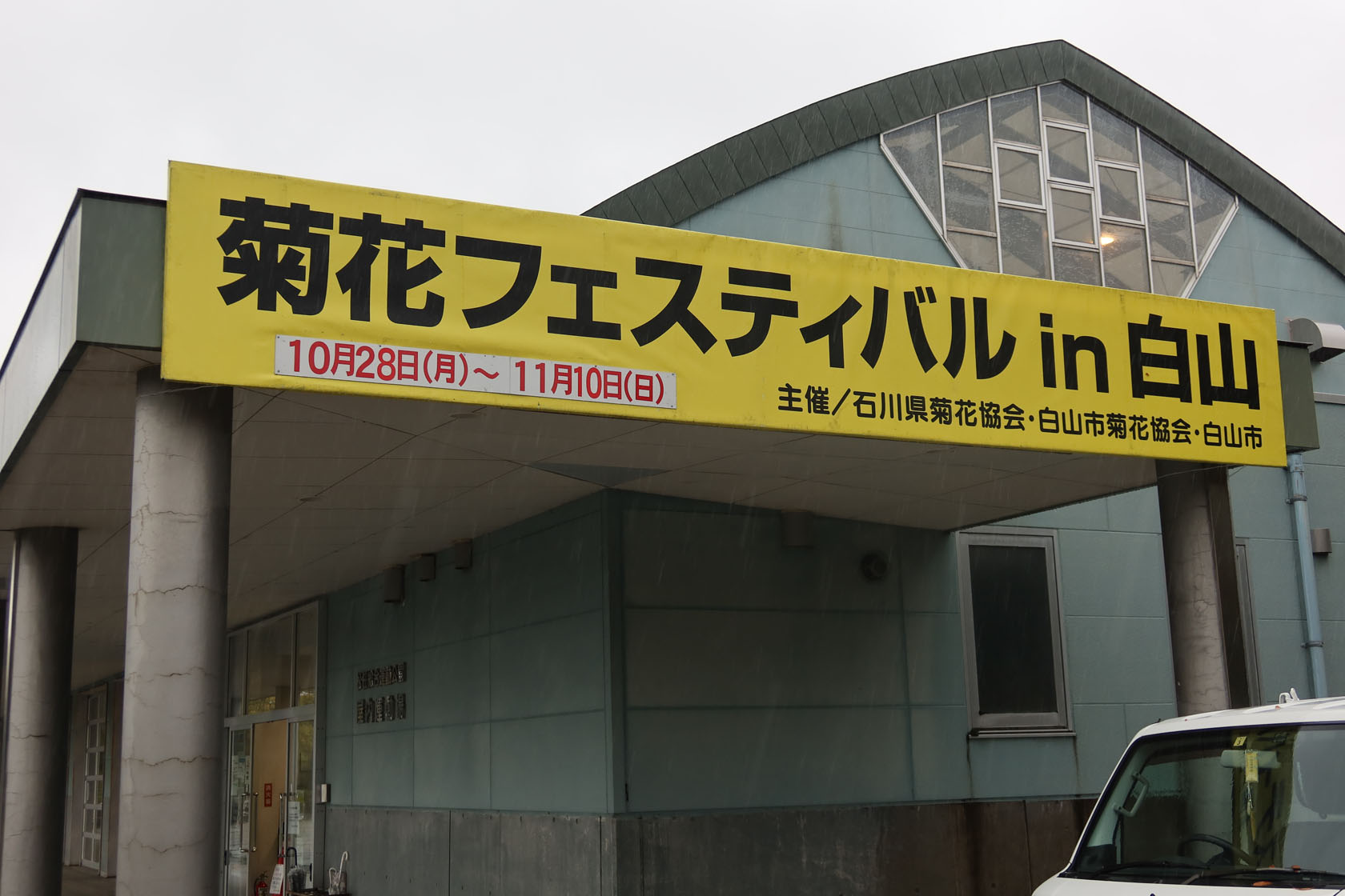 別に菊花に興味があるという訳ではありませんが、近くでやってるというのと、屋内で開催されているので雨でも大丈夫なので行ってみました。また、先日行ってきたたけふ菊人形の菊花がまだほとんど咲いてない状況だったので、咲いている菊を見るのもいいかなと思ったのでした。