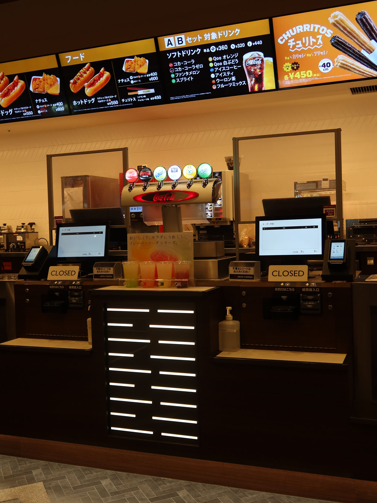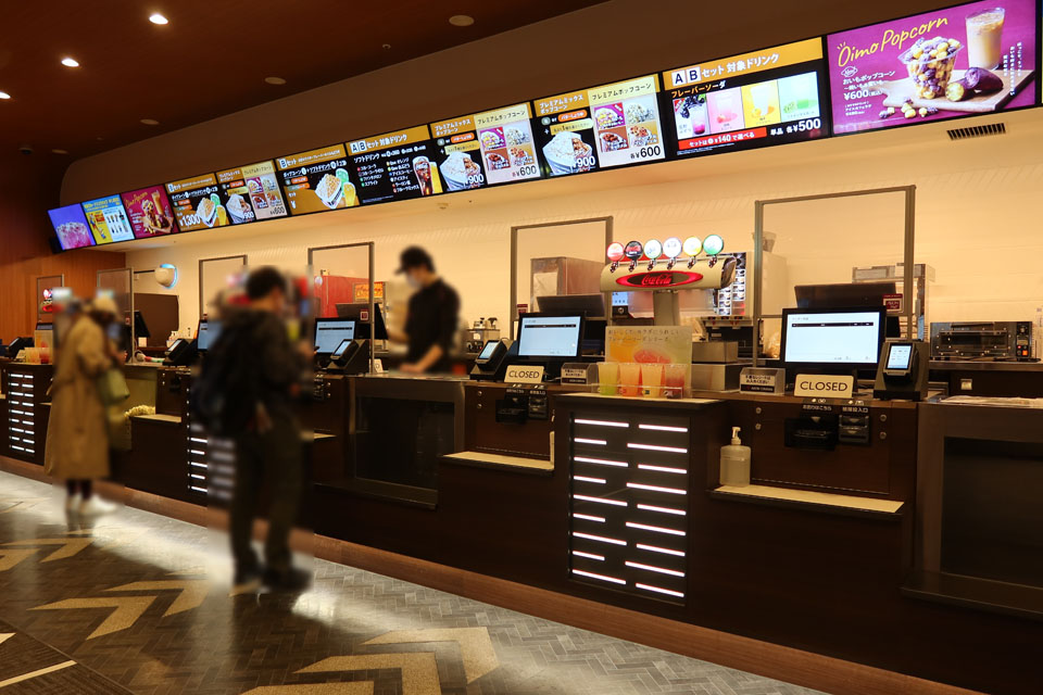 先日行ってきたイオンモール白山のイオンシネマ同様、イオンシネマのシステム更新によって発券機などが新しくなってました。飲食物の販売も端末から注文するようになってます。ただ、イオンモール白山のイオンシネマでは発券機と似たような端末がずらりと並んでいましたが、フォーラスの場合は販売所に端末が置かれています。