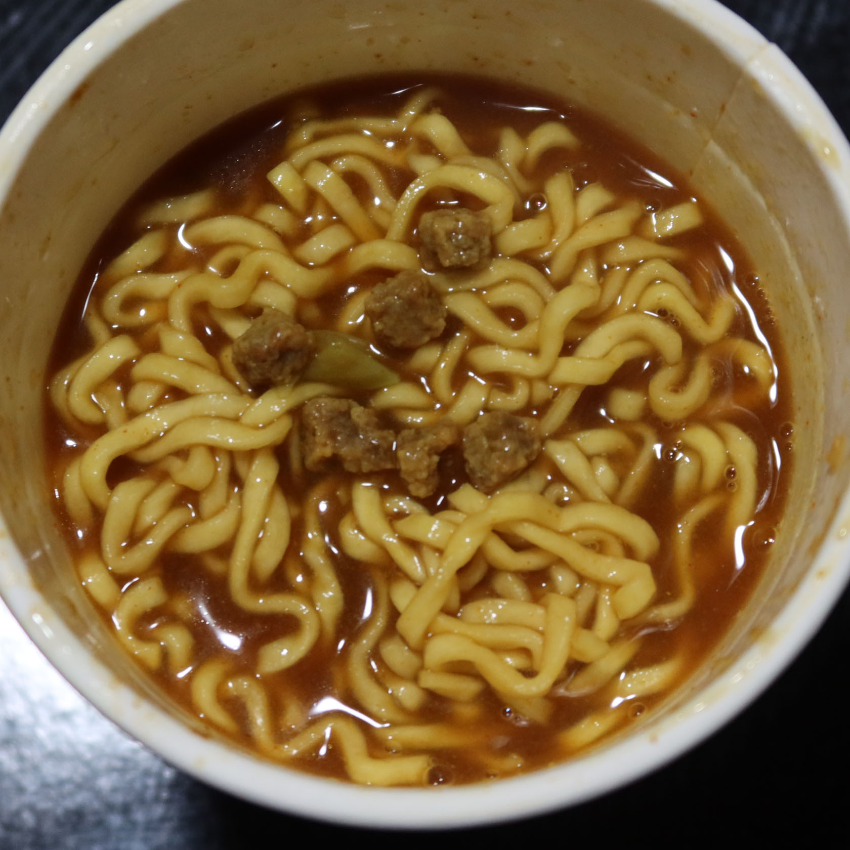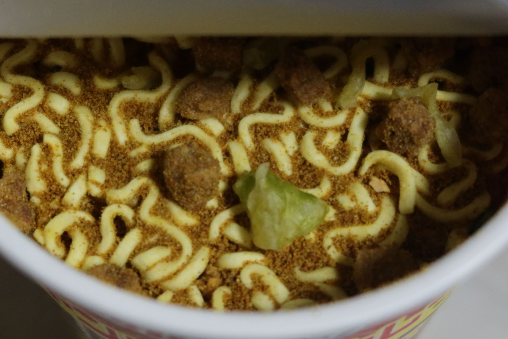 「スープにとろみが出るまでカップの底からよくかき混ぜてください」とのことで、かなりよく混ぜたつもりでしたが、それでも麺を食べた後に残ったスープの底にはまだ溶けきっていないスープが少し残っていました。