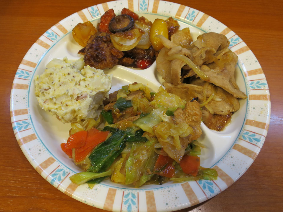 豚の生姜焼きと酢豚、メインは八宝菜です。少し空いたところにはポテトサラダを入れてみました。